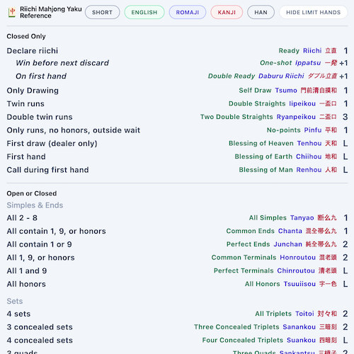 A compact yaku reference sheet for beginners in riichi mahjong.